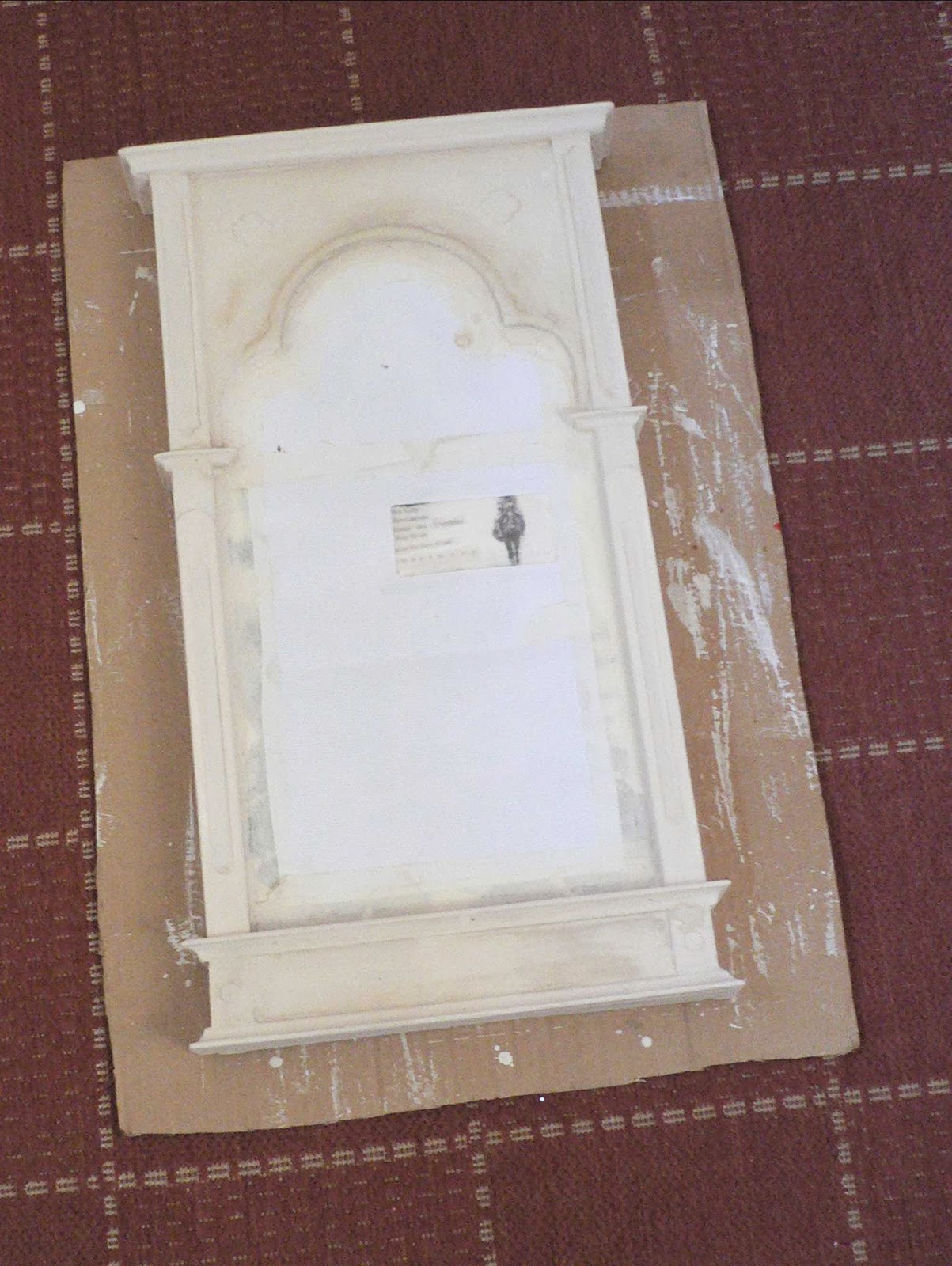 I primed the central panel and applied acrylic transfers to it before starting the carcass, so in this view it is masked off with paper. The construction is quite crude, with the really rough bits improved with home-made plastic wood. Then I gave the carcass two coats of traditional gesso sottile (rabbit skin glue and whitening), to provide a surface that I could sand and polish before gilding: