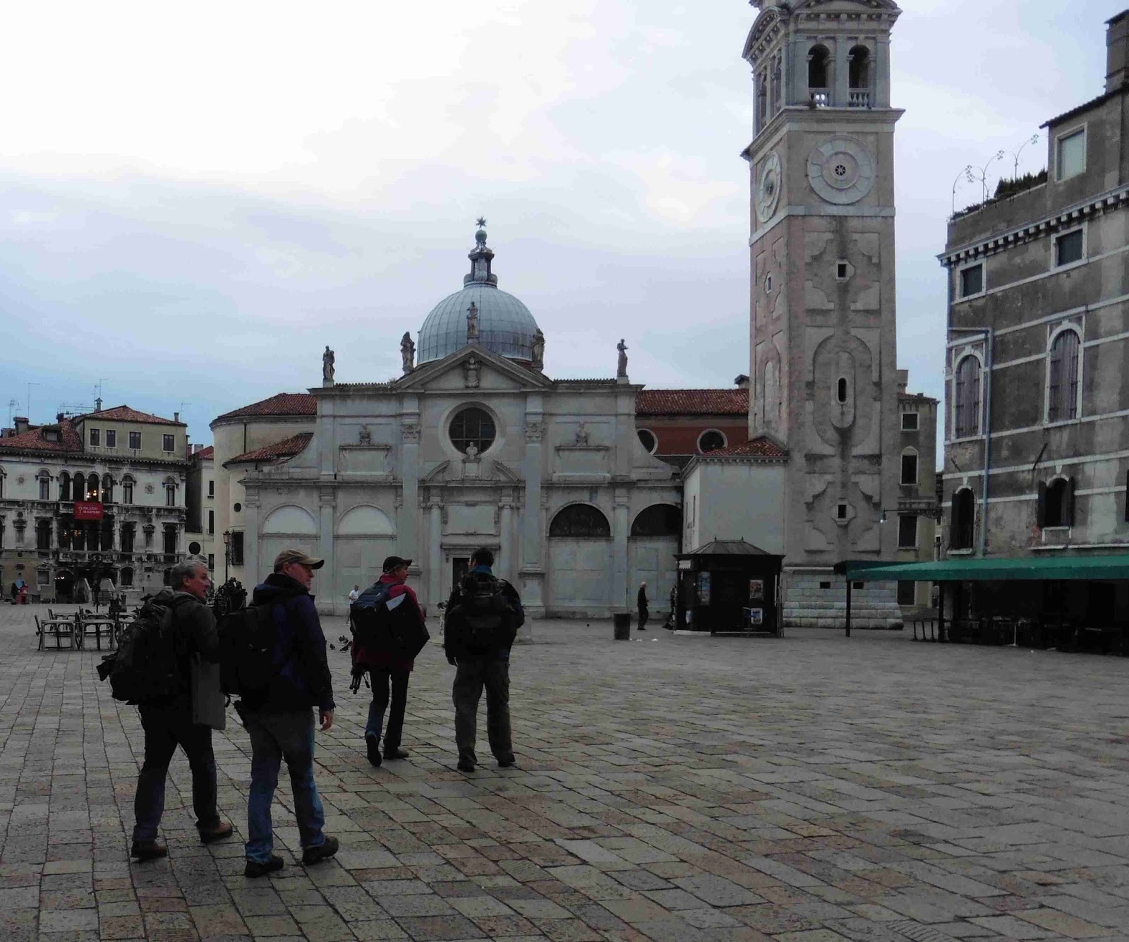 aqua alta. We walked to St Mark's hoping to get one in before the crowds and the water appeared. In the event we had both to contend with. Paul and I pitched straight away in the corner uner the clock tower, using the arcade as shelter from the drizzle.